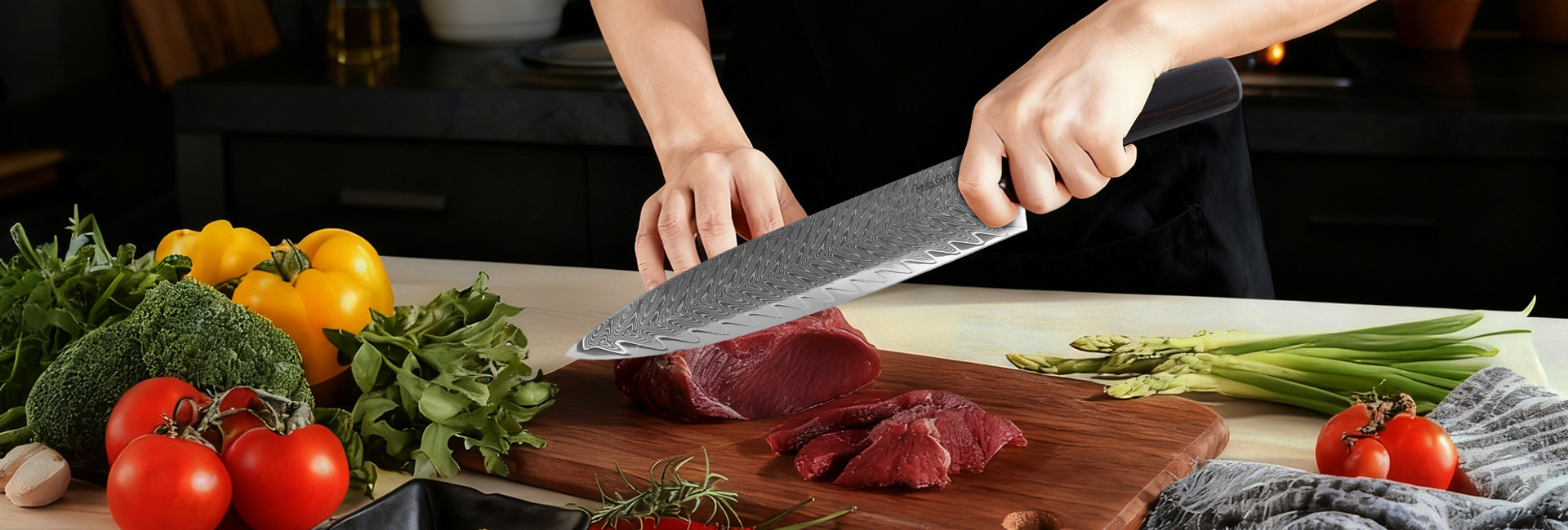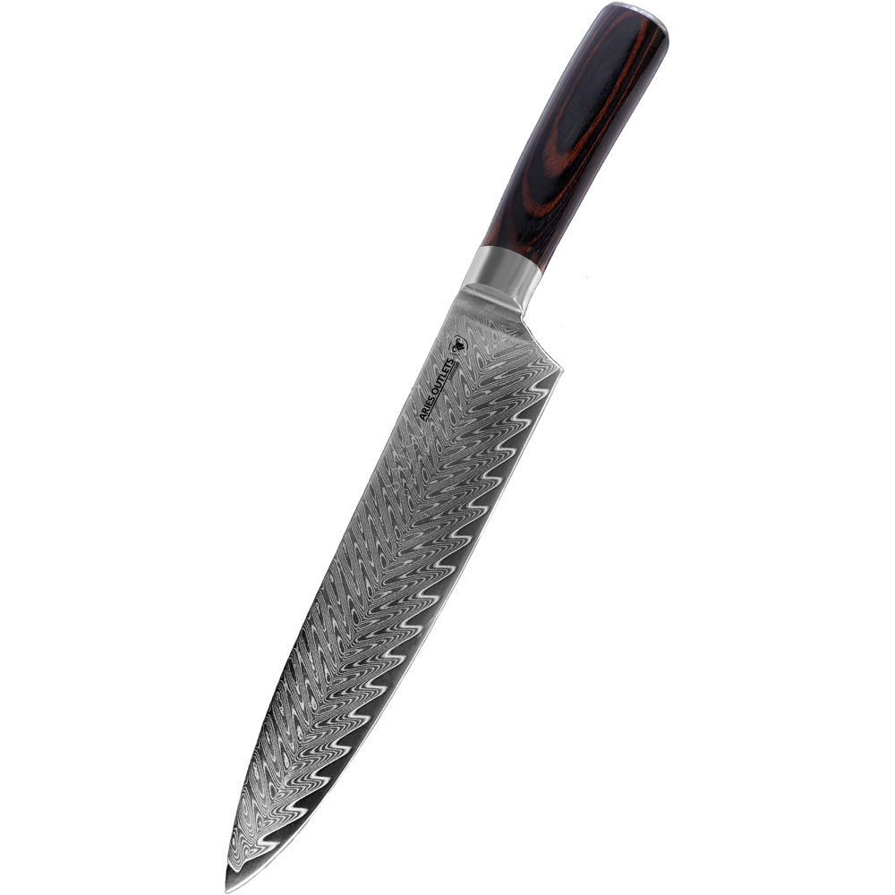 Jeder Koch braucht ein gutes Kochmesser! Unser beliebtes 8-Zoll Damaskusstahl-Kochmesser bietet herausragende Qualität: Die Klinge ist hart und langlebig, mit einzigartigen Wellenmustern, und die Schneide ist scharf und präzise. Es ist das "Allzweckmesser" in der Küche und eignet sich mühelos zum Schneiden von Gemüse und Hacken von Fleisch.