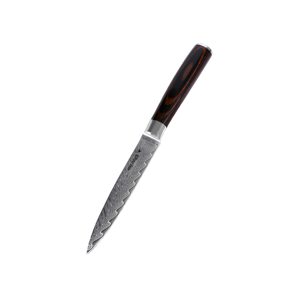Viele Köche lieben das Santokumesser! Unser 7-Zoll Damaskusstahl-Santokumesser ist ein wahres Allround-Talent in der Küche: Das "Santoku" eignet sich perfekt zum Schneiden, Zubereiten und Bearbeiten von Fleisch, Fisch und Gemüse. Das abgerundete Ende sorgt für mehr Sicherheit, und die Schneide ist scharf und äußerst praktisch.